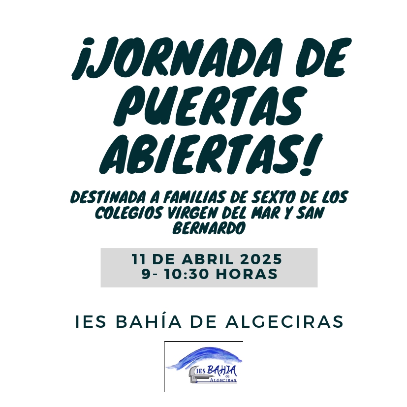 El día 11 de abril se celebrará una jornada de puertas abiertas para las madres y los padres del alumnado de 6º de primeria de nuestros centros adscritos: CEIP San Bernardo y CEIP Virgen del Mar, que quieran conocer el instituto. Quien esté interesado puede acudir al centro de 9:00 a 10:30 horas.